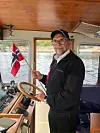 Knut Egil Knutsen i kjent stil bak roret på M/B James, taxibåten som han fører til daglig. Knutsen tar nok en gang initiativ til båtkortesje på 17. mai. Og metereologene lover pent vær på Hvaler, så alt skulle ligge til rette for en fin tur på sjøen.