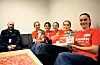 Hyggelig stemning i "målommrådet" på skolen, der bøssebærerne kom inn, leverte bøsser, og fikk pølser, vafler, brus og kaffe. Fra venstre: Philip Roberts, Johanne Pettersen, Sofia Bjørke, Maren Aasen Herikstad, Elise Lande og Hedda Solbakken.