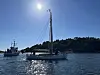 Fullklaff med både vær og arrangement da Nordisk skutetreff ankom Bukta ved fergeleiet på Nordre Sandøy. Her en svensk båt på vei inn.