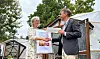 Anne Marit Skovly fikk Hagekulturprisen 2022 av generalsekretær i Det norske hageslskap, Tron Hirsti.