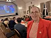 En glad arbeiderpartileder Merete Pedersen etter at de første valgresultatene tikket inn klokken 21.00 mandag kveld.