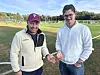 Hvaler IL sin trener Lasse Tveit og kaptein Rolf Kristian Mathisen viser frem det unike banedekket på den nye kunstgressbanen på Asmaløy.