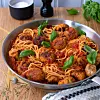 Spagetti og kyllingkjøttboller i tomatsaus - enkel, billig og velsmakende middag.