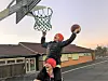 Det er så gøy å spille basket, mener Mathias Larsen og Johannes Jovan Lande. Her skal Mathias sende ballen i kurven fra skuldrene til Johannes.