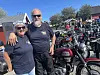 Alice Christensen og Gisle Ørbæk Andersen fra Greåker har lagt forholdene til rette for BSA-samlingen. Mandag var 150 BSA-entusiaster samlet på tur til Skjærhalden torg. Her står Alice og Gisle ved en BSA 750 Rocket 3, en tresylindret maskin. - Jeg tror det er en 1968-modell, sier Gisle.