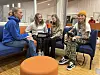Ingeborg Senneset (til høyre) tok en god samtale med ungdomsskoleelevene Elise Skjefstad-Nilsen, Adine Juliana Moen og Iselin Bjerke Nybøle etter foredraget i auditoriet. I sofaen finner vi også Sennesets bullterrier Lucky, som er vant med å være med på scenen.