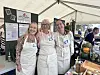 SJokolademaker Elin Blindheim og Betsy Engly Braseth fra Havnehagen Engly sto sammen i teltet til det nye samvirkelaget NYT Hvaler under Eplefestivalen. Her sammen med Anne Marit Skovly.