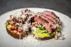 USLÅELIG: Stekt surdeigsbrød med entrecôte, avokado, tomat og parmesan får tennene til å løpe i vann.