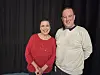 Jenny Jensen elsker å opptre på Hvaler-scener, der hun får nær kontakt med publikum. Her sammen med ildsjel og kulturleder, Thomas Holmen Olsen. - Dere er heldige som har en slik ildsjel, roser Jensen.