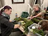Lise Fremme og Cecilie Grønneberg fester mose og granbar på sine kranser.
