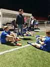 Hvaler-trener Lasse Granath snakker med slitne Hvaler-spillere etter at laget sikret seg ett poeng mot Råde.