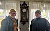 Paul Henriksen og urmaker Morten Eilertsen med det tyske vegguret som nå er montert på veggen i den såkalte finstua på Gamle Brekke skole.