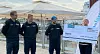 Mona Flemmen overrakte en sjekk på 75.000 kroner fra Hvaler Hytteforening til Redningsskøyta. Her representert ved skipper Magnus Andersen (til høyre), maskinist Erik Bustgaard og overstyrmann Joakim Borgund . Hytteforeningen gir hvert år 25.000 kroner av overskuddet til Redningsskøyta på Hvaler.