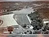 Bilde av prestegården med kirken tatt i 1953. Oppe til høyre i bildet bygningene på gården Brekke, også det en gang en del av kirkens eiendom.