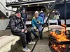 Julehygge med julegløgg foran bålpanna. - Det er så fint å ha et vannhull å besøke her på Søndre Sandøy, sier Reidar Andersen (til venstre). Her sammen med Ole-Thomas Krossholm. Begge bor i Gravningsund. I bakgrunnen Stig Ulfsby.