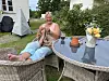 Kari Reinertsen fra "Lange Flate Ballær" tar med strikketøyet når hun skal nyte gårdslivet ute på Holte gård.