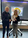 Mie Linnea Nystrøm Araldsen med diplomet som viser at hun ble sonevinner i tegnekonkurransen FN Fredsplakat.